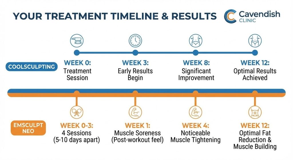 At Cavendish Clinic, we call this combination Chisel ‘N’ Chill. The strategy is straightforward: use CoolSculpting first to reduce the fat layer, then follow up with Emsculpt Neo to build and define the muscle underneath.